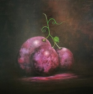 2024Appels in paars expressief neergezet (behorend bij een setje met een peer in dezelfde setting.